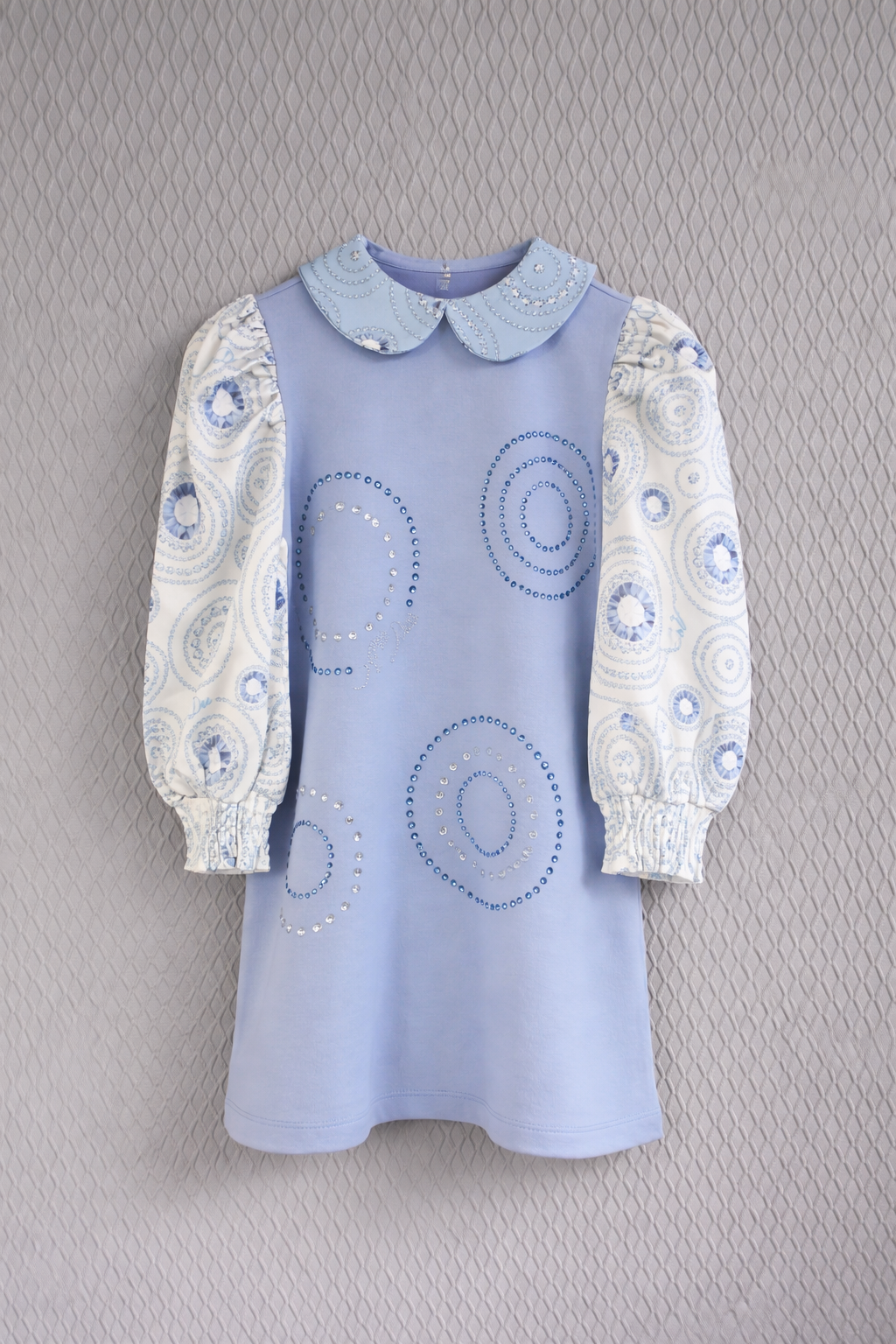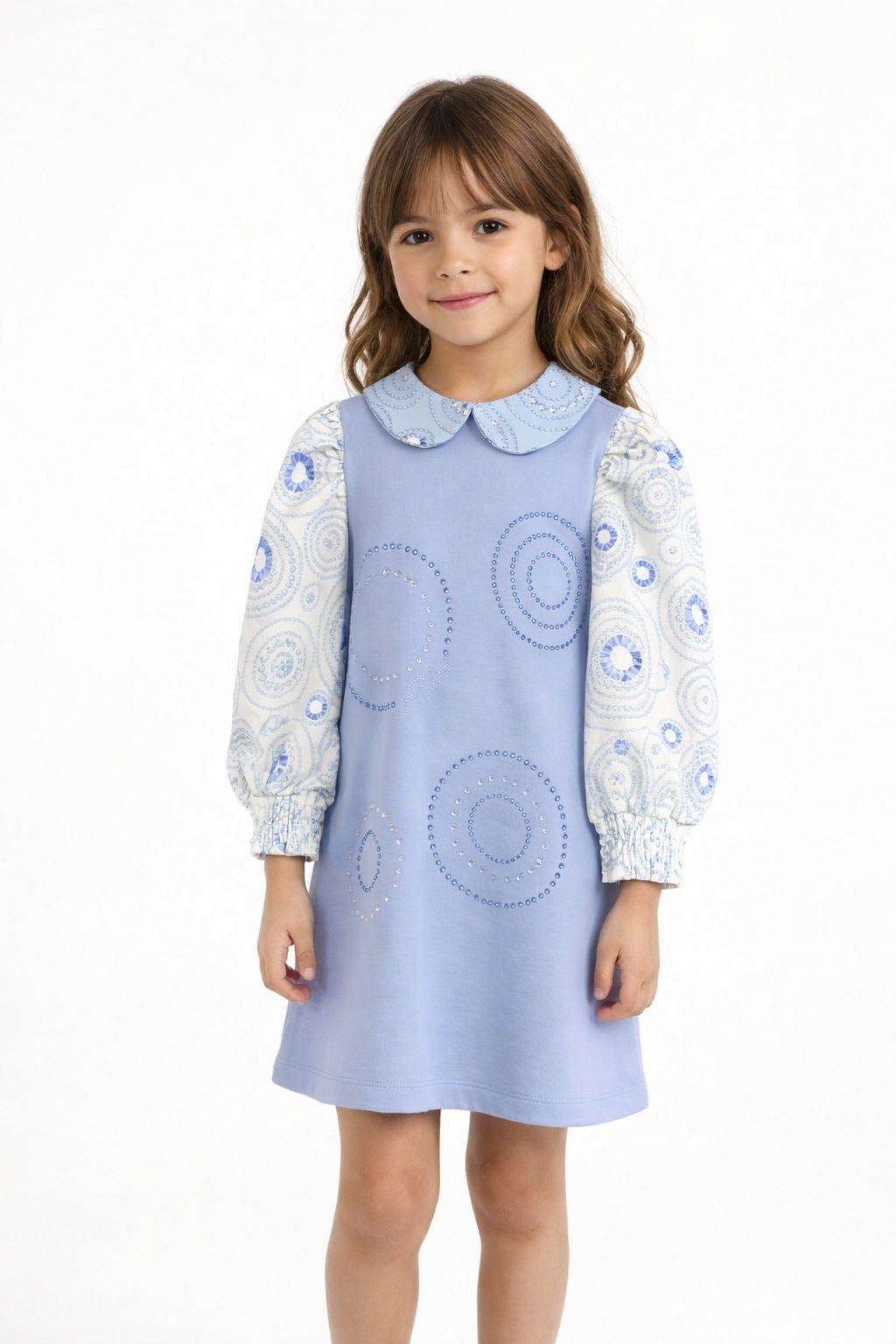2-5 yaş kız çocuk mavi elbise, zarif tasarımı ve modern detaylarıyla hem günlük kullanım hem de özel günler için ideal bir seçenektir. Ön kısmındaki taş işlemeli detayı şık bir görünüm sunar. Desenli uzun kolları ve Peter Pan yaka tasarımı klasik bir stil kazandırır. Rahat kalıbı sayesinde çocukların gün boyu konforlu hareket etmesini sağlar.