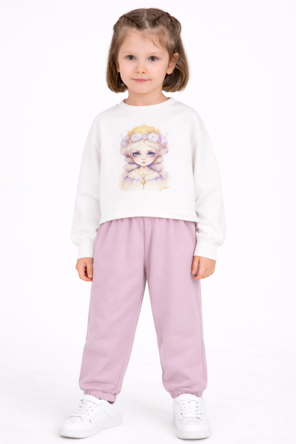 2-6 yaş kız çocuk eşofman takımı, şıklık ve rahatlığı bir arada sunan günlük bir kombin seçeneğidir. Ön kısmındaki zarif kız figürlü baskı detayı, modele sevimli ve modern bir görünüm kazandırır.