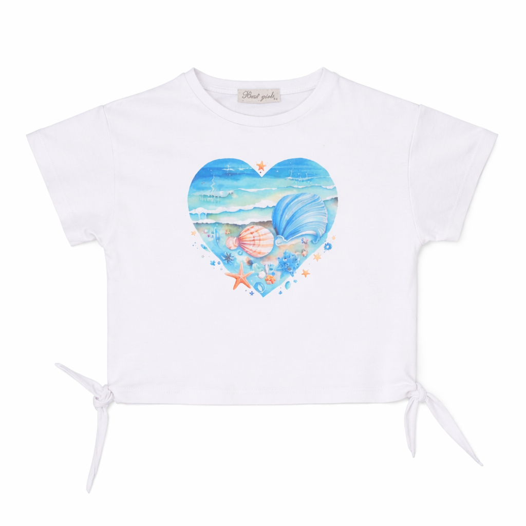 2-6 Yaş Kız Çocuk Deniz Temalı Kalp Baskılı Tişört