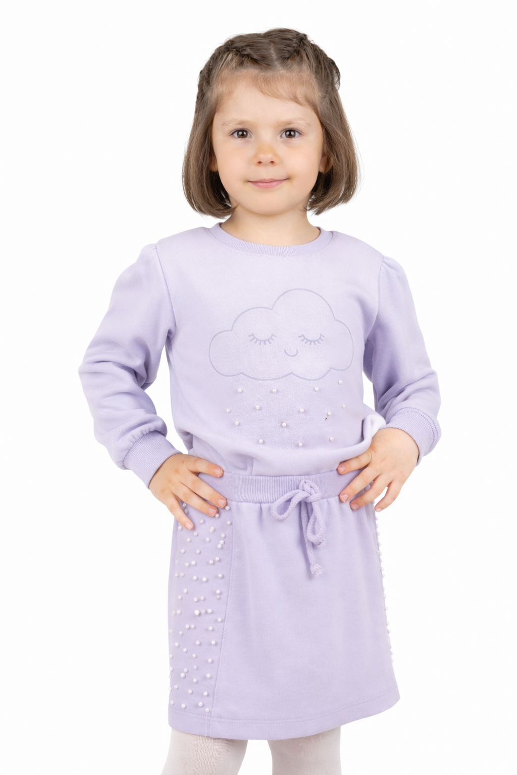 2-6 yaş kız çocukları için tasarlanan lila Selanik kumaş takım, şık ve rahat yapısıyla öne çıkar. Bulut desenli sweatshirt ve inci detaylı etek, sevimli ve modern bir görünüm sunar. Esnek yapısı sayesinde gün boyu hareket özgürlüğü sağlar. Günlük kullanım ve özel günler için uygun olan bu takım, zarif lila rengiyle dikkat çeker.