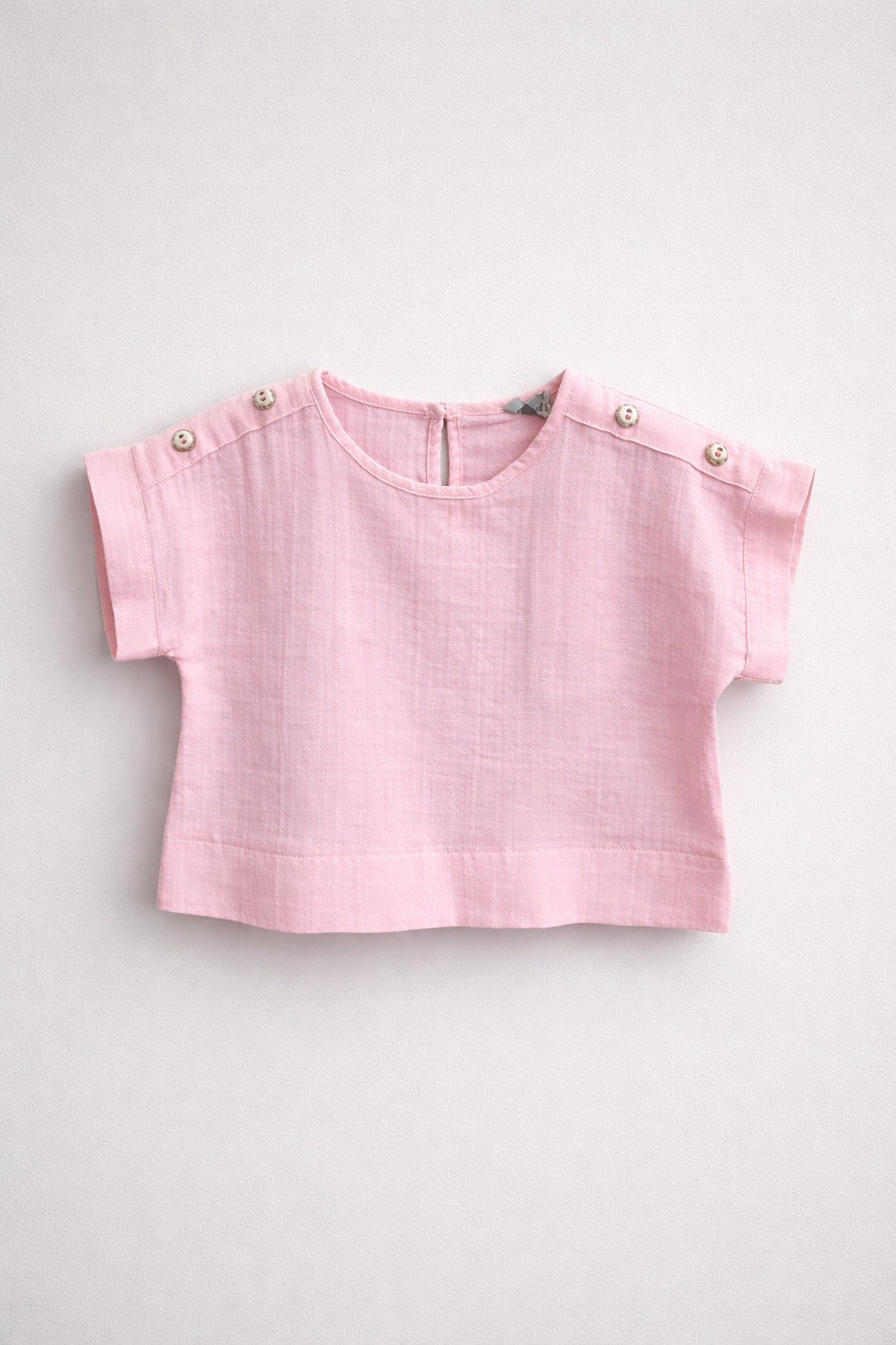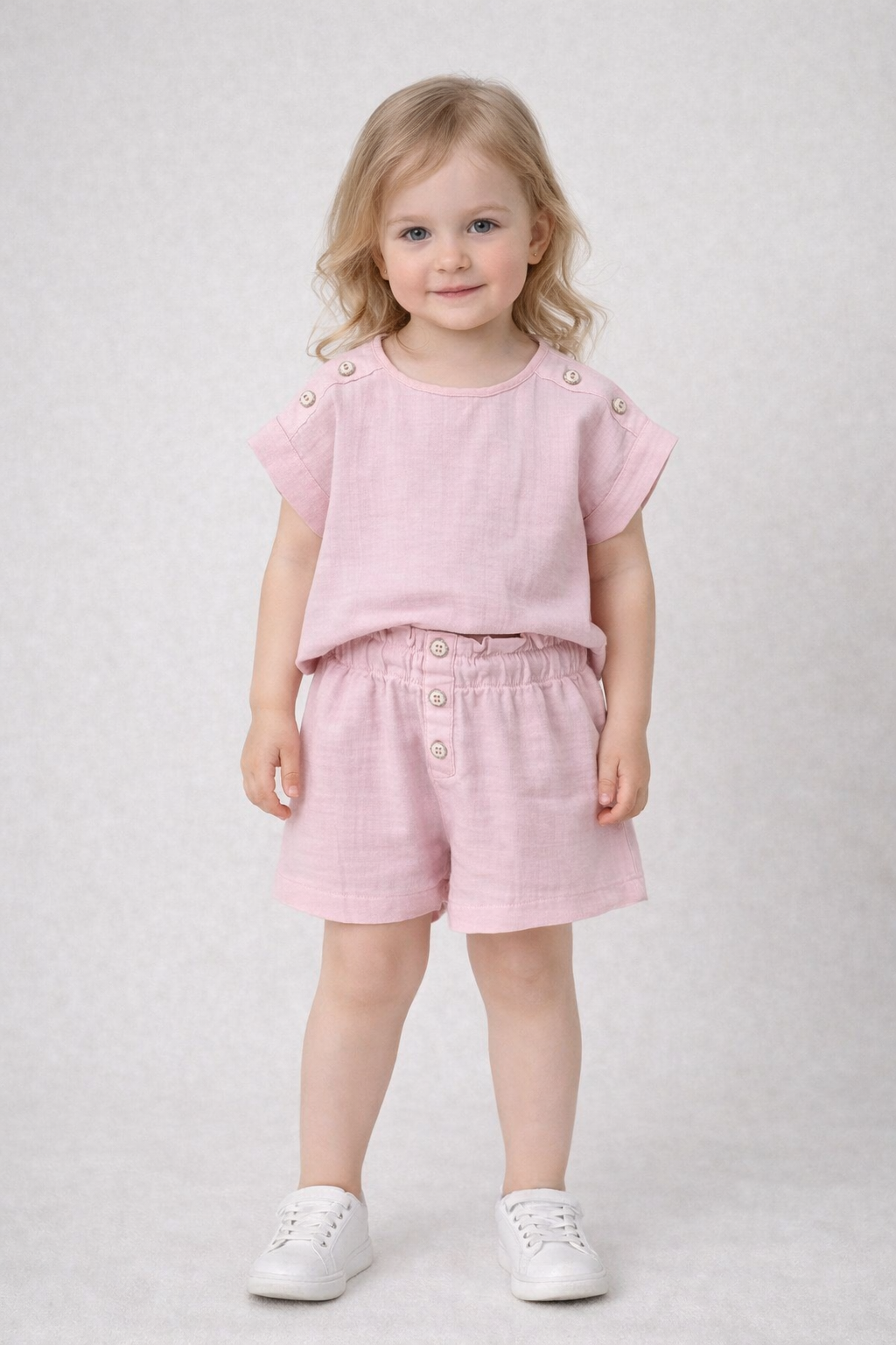 2-6 yaş kız çocuk pembe şortlu takım, yaz ayları için şık ve konforlu bir seçenektir. Nefes alabilen müslin pamuk kumaşı sayesinde gün boyu rahatlık sağlar. Bisiklet yaka kısa kollu üst ve lastikli yüksek bel şort tasarımıyla kullanım kolaylığı sunar. Günlük kullanım, park, tatil ve özel günler için ideal bir tercihtir.