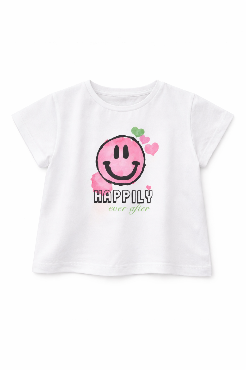 2-6 yaş smiley baskılı beyaz kız çocuk tişört, enerjik ve eğlenceli tasarımıyla günlük kombinlere neşe katar. Ön kısmındaki pembe smiley ve kalp detayları sevimli bir görünüm sunar. Şort, etek ve pantolonlarla kolayca kombinlenebilen bu model; günlük kullanım, okul, park ve tatil için ideal bir kız çocuk tişörtüdür.