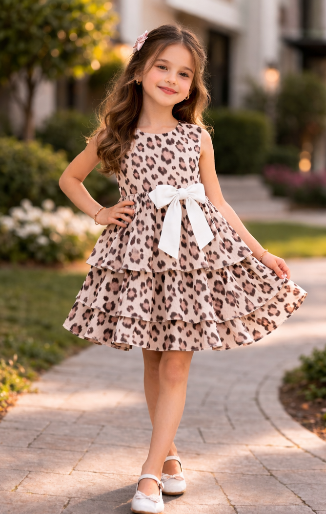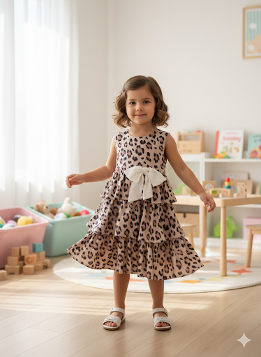 2-7 yaş kız çocukları için tasarlanan leopar desenli fırfırlı elbise, şık ve eğlenceli tasarımıyla öne çıkar. Kat kat fırfırları ve beldeki kurdele detayı elbiseye hareketli bir görünüm kazandırır. Günlük kullanımın yanı sıra doğum günü ve özel davetler için ideal olan bu model, konfor ve stil sunar.