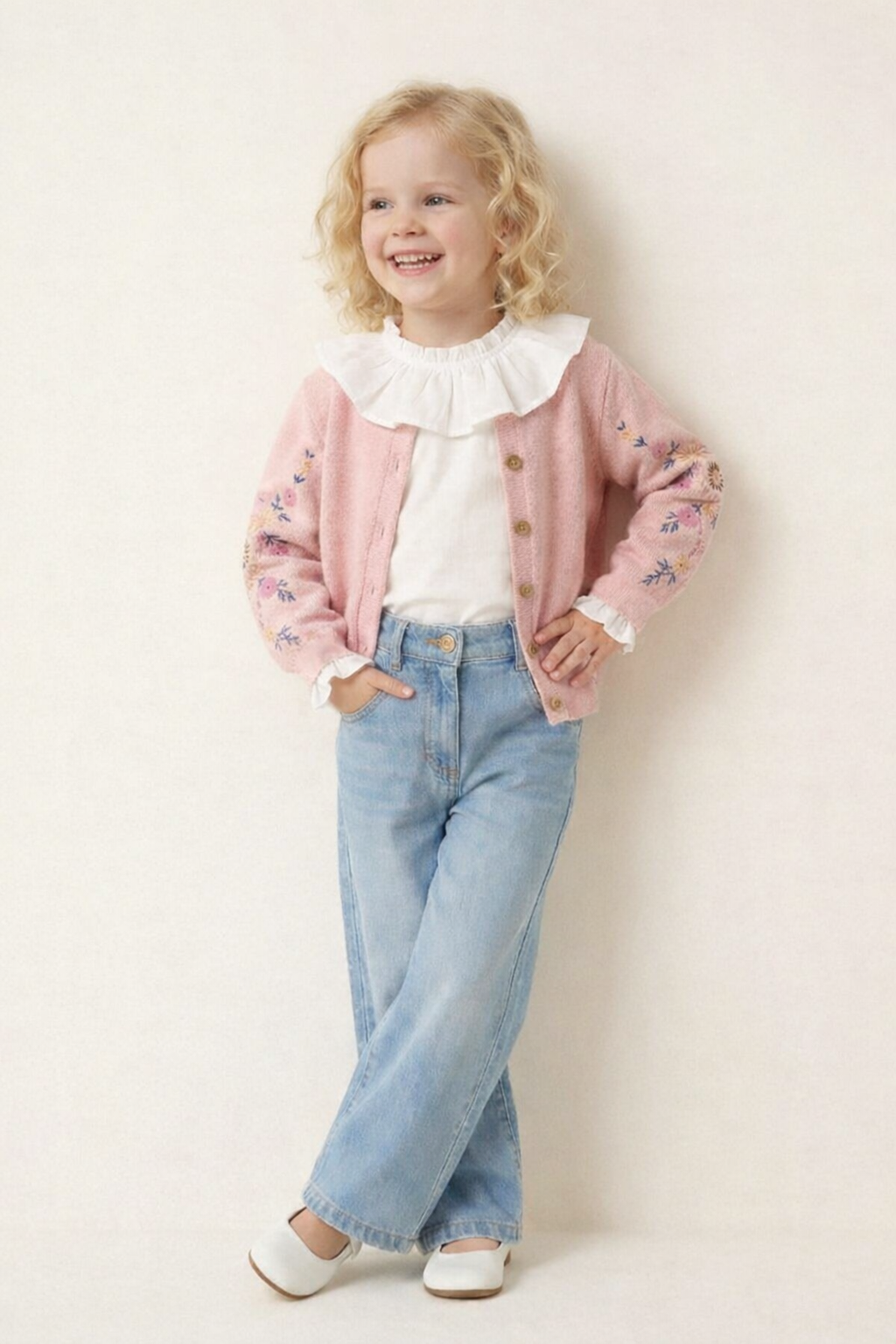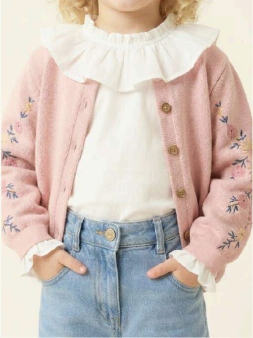 2-8 yaş kız çocukları için tasarlanan triko hırka ve jean pantolon kombin, şık ve rahat yapısıyla öne çıkar. Çiçek nakışlı hırka ve fırfır yakalı bluz zarif bir görünüm sunar. Yüksek bel jean pantolon ise gün boyu hareket özgürlüğü sağlar. Okul, günlük geziler ve özel günler için ideal bir kombin seçeneğidir.