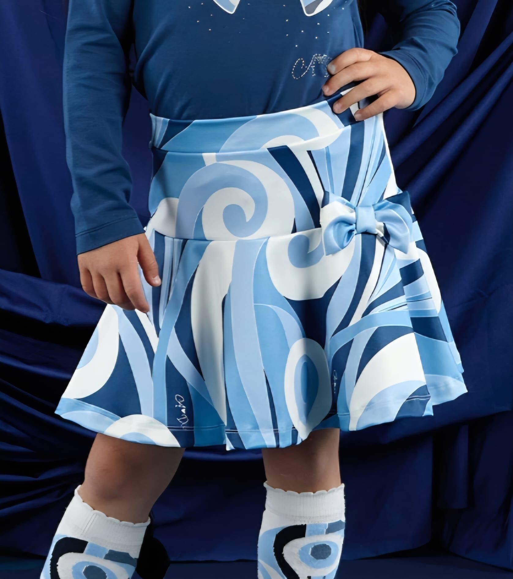 3-12 yaş kız çocukları için tasarlanan desenli mavi etek, modern ve şık tasarımıyla öne çıkar. Geometrik desenleri enerjik bir görünüm sunarken, beldeki fiyonk detayı sevimli bir dokunuş katar. Hafif kumaşı ve rahat kalıbıyla gün boyu konfor sağlar. Günlük ve özel kombinler için ideal bir parçadır.