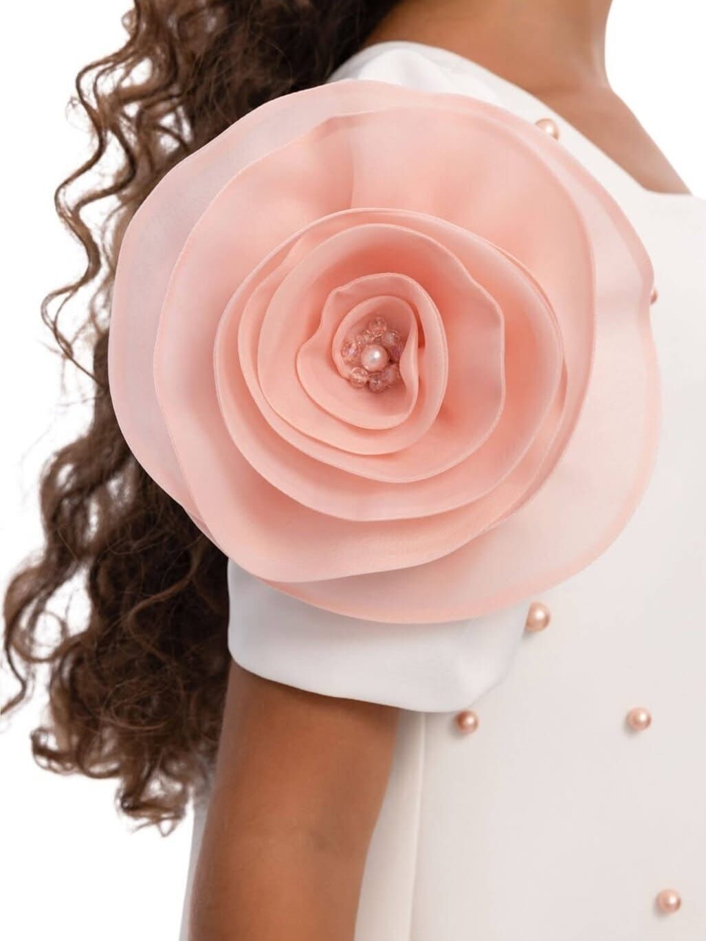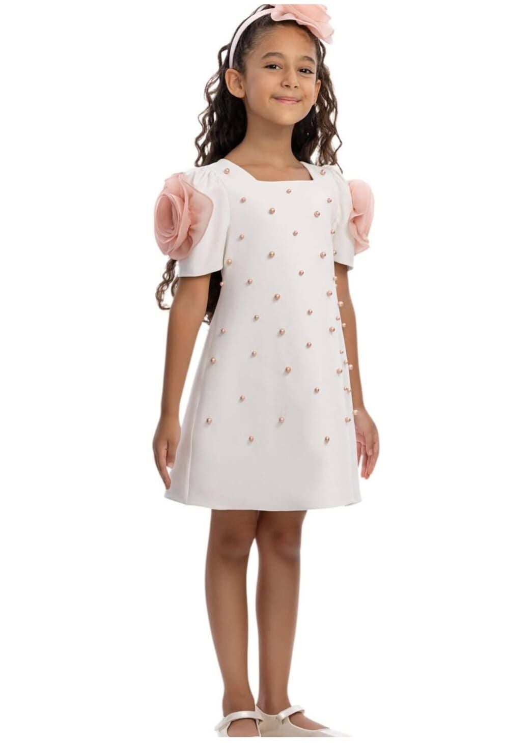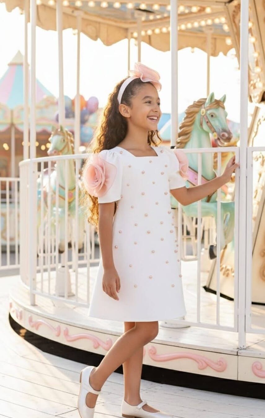 3-7 yaş kız çocukları için tasarlanan ekru inci detaylı elbise, zarif ve şık tasarımıyla öne çıkar. İnci süslemeleri ve omuzdaki gül aplikeleri elbiseye romantik bir görünüm kazandırır. Doğum günü, bayram, düğün ve davetlerde tercih edilebilecek bu model, özel günler için ideal ve zarif bir seçenektir.