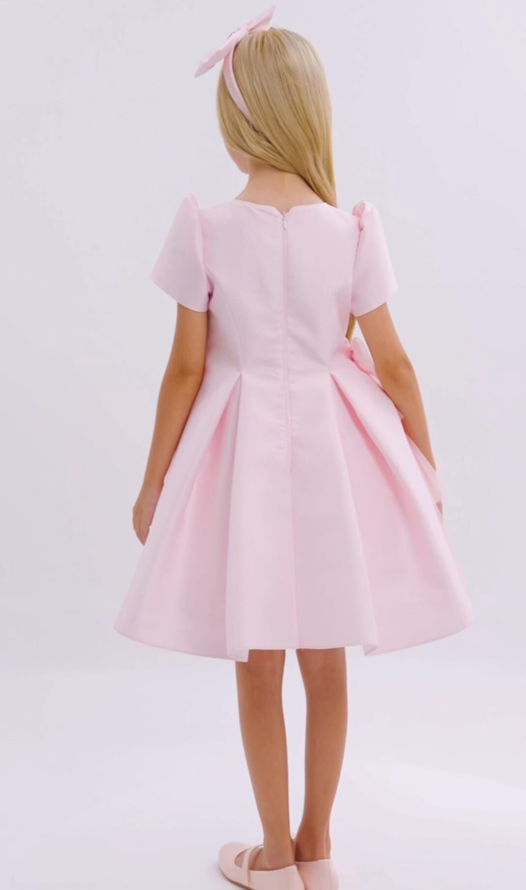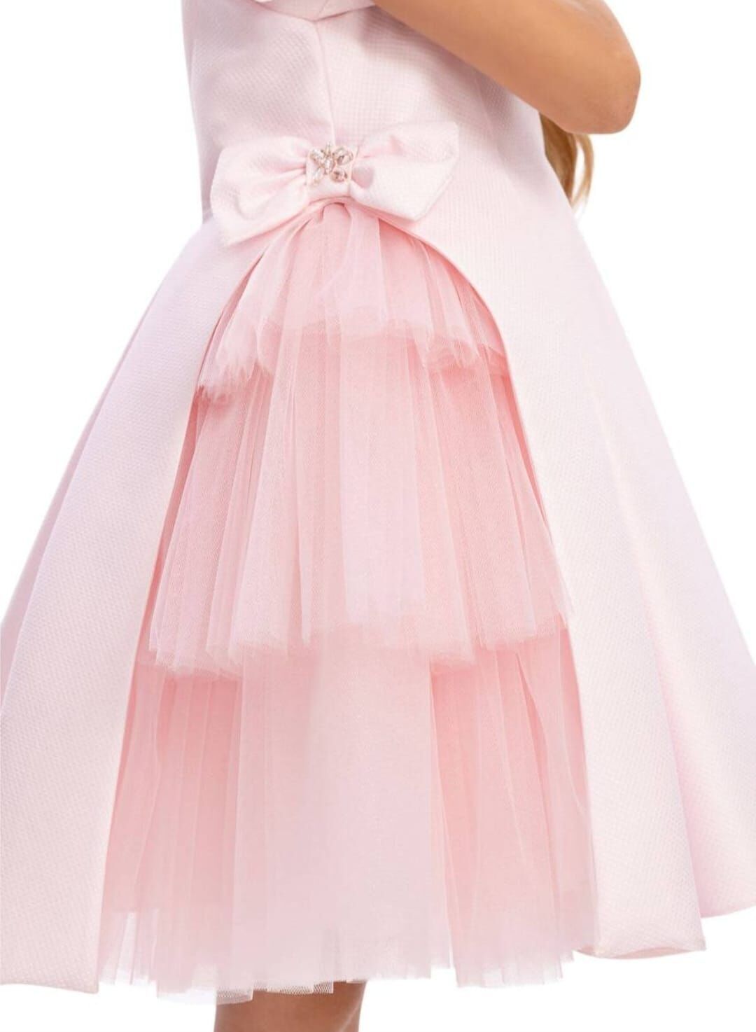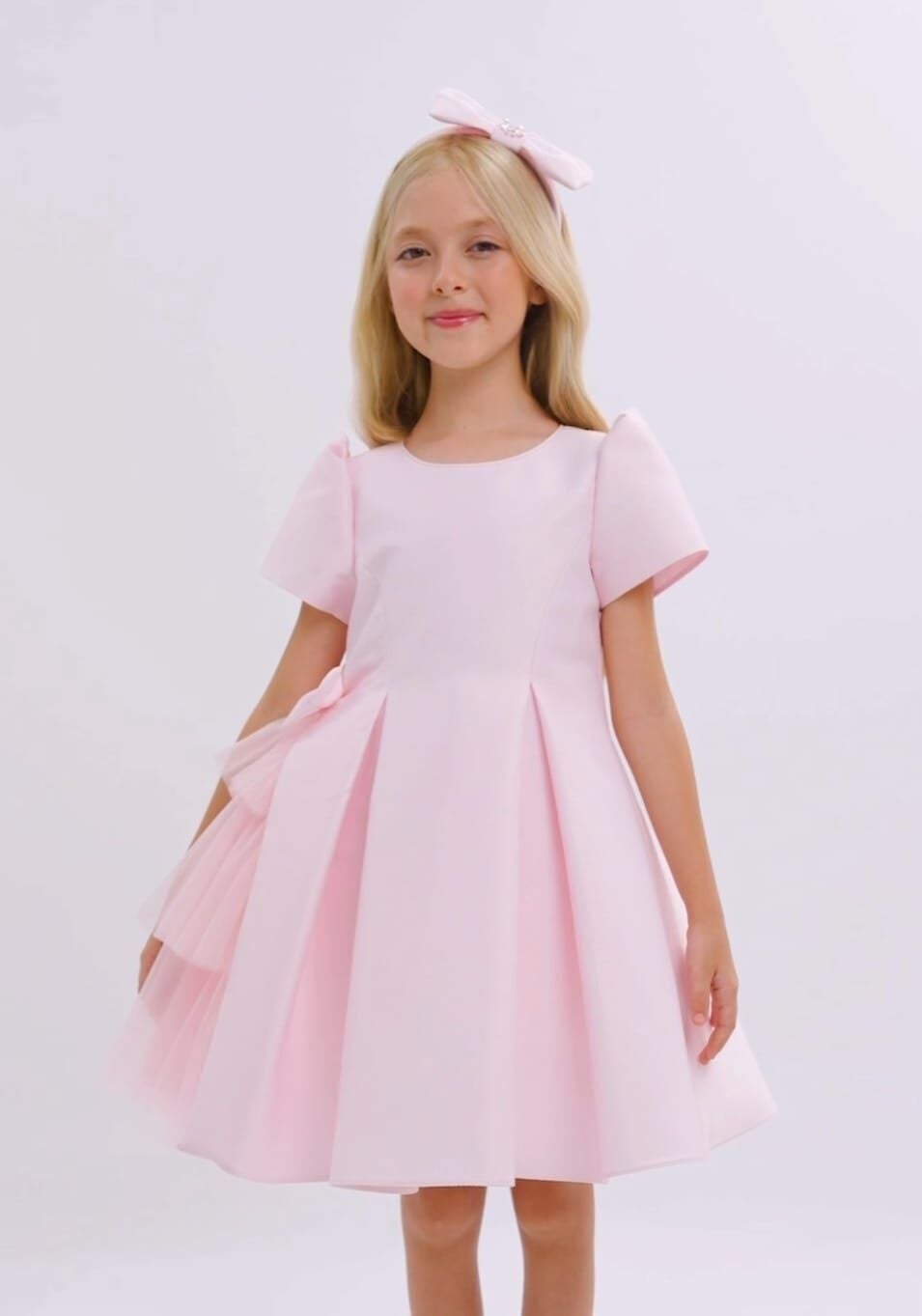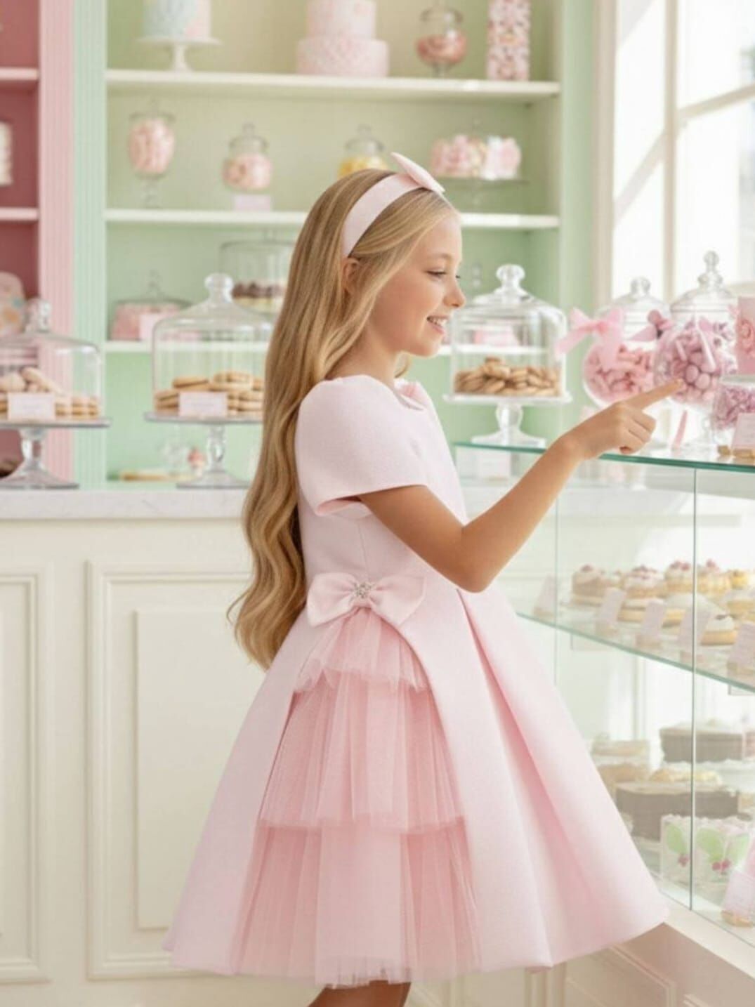 3-7 yaş kız çocukları için tasarlanan pudra pembe elbise, zarif ve modern tasarımıyla öne çıkar. Sade üst kısmı ve pileli etek yapısı elbiseye hacimli bir görünüm kazandırır. Tül fiyonk detayıyla dikkat çeken model, doğum günü, bayram, düğün ve davetlerde tercih edilebilecek şık ve zarif bir seçenektir.