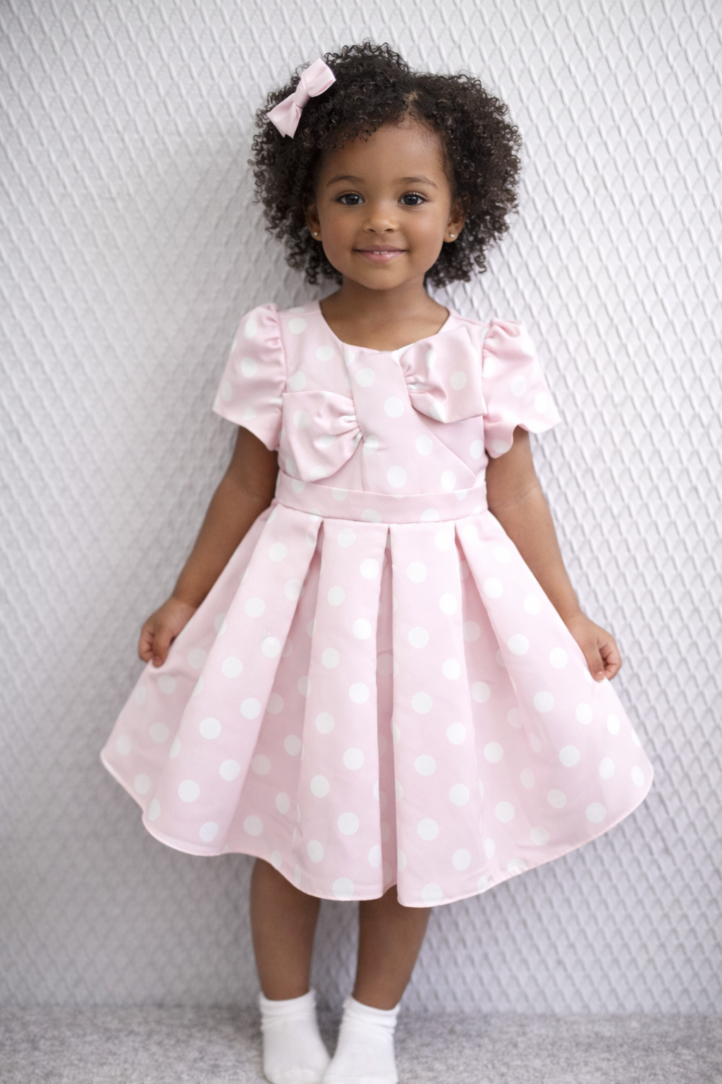 3-7 yaş kız çocuk pudra pembe puantiyeli elbise, zarif tasarımı ve şık detaylarıyla hem günlük hem özel günler için ideal bir modeldir. Puantiye deseni ve fiyonk detayı sevimli bir görünüm sunar. Pileli etek hareketli bir stil kazandırır. Rahat kalıbı sayesinde konfor sağlar, doğum günü ve davetlerde tercih edilebilir.