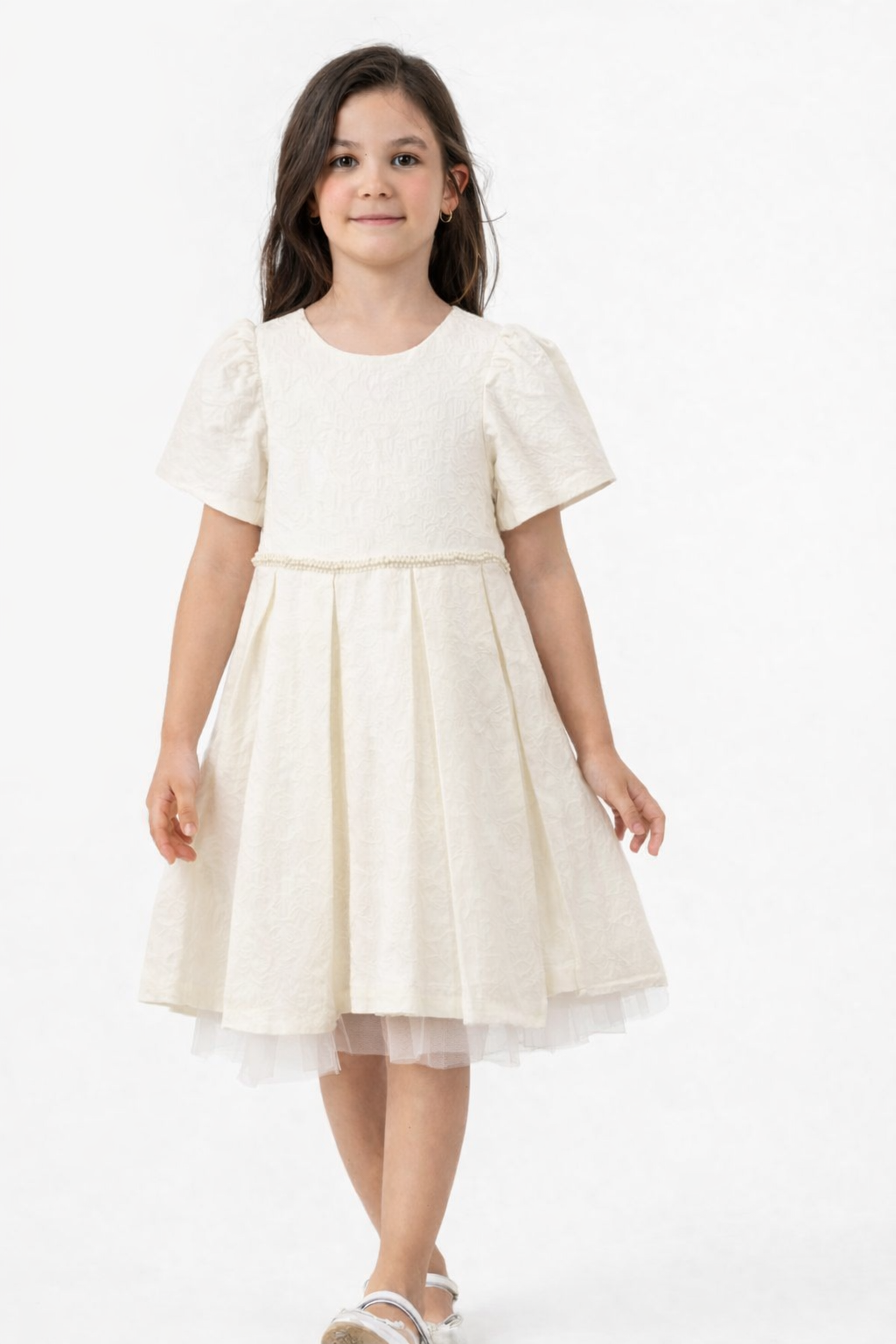 3-8 yaş kız çocukları için tasarlanan ekru elbise, zarif ve şık tasarımıyla öne çıkar. Kabartmalı dokulu kumaşı ve tül detaylı astarıyla dikkat çeken model, gün boyu konfor sağlar. Rahat kesimiyle hareket özgürlüğü sunar. Doğum günü, bayram, davet ve özel etkinliklerde tercih edilebilecek ideal bir elbise seçeneğidir.