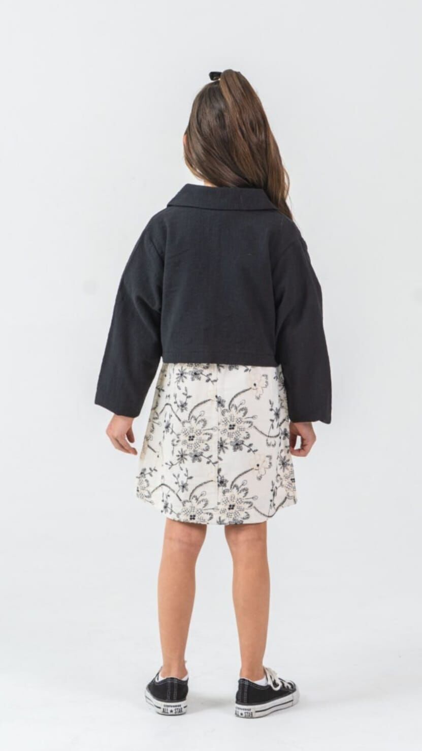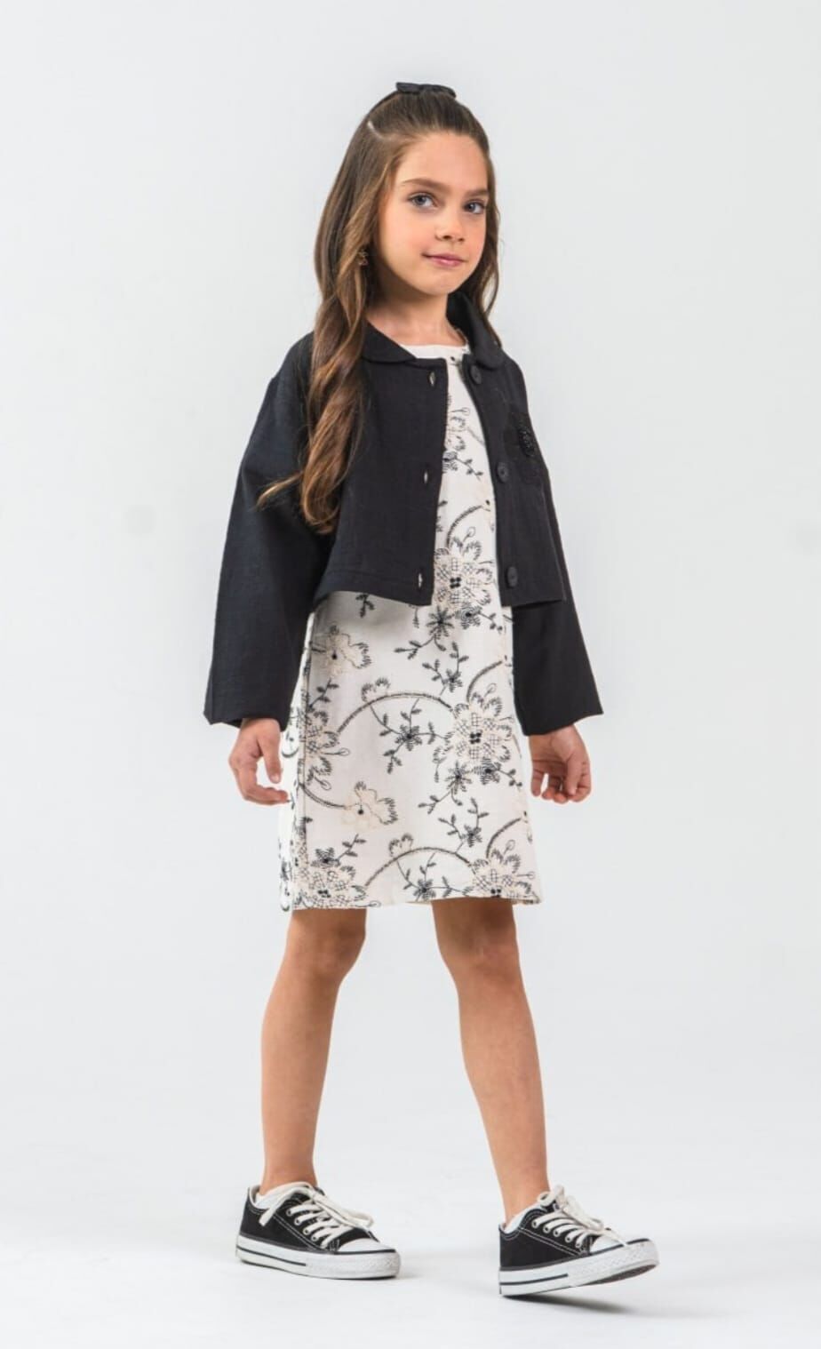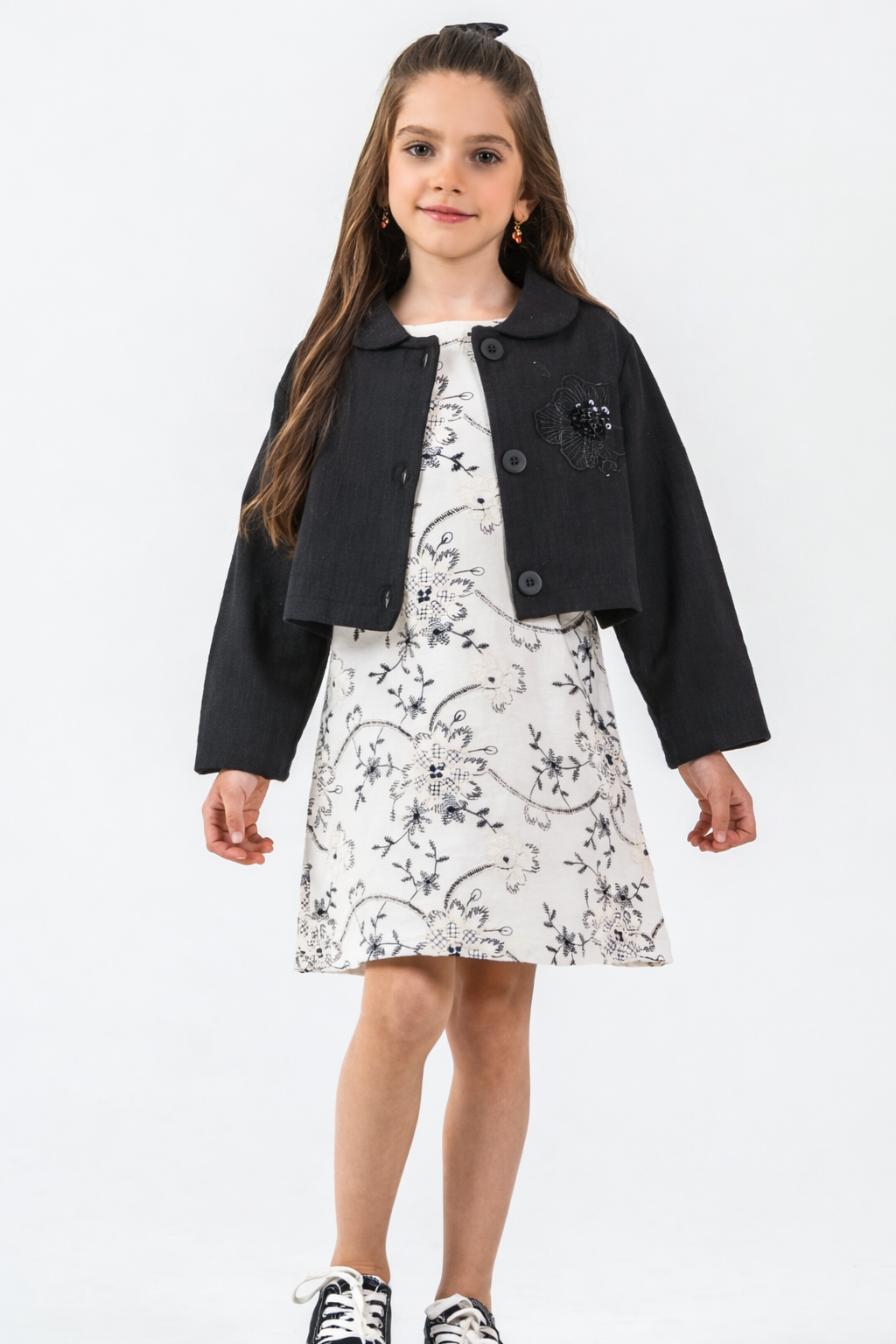 4-14 Yaş Kız Çocuk Keten Nakışlı Elbise Siyah Ceket Takım