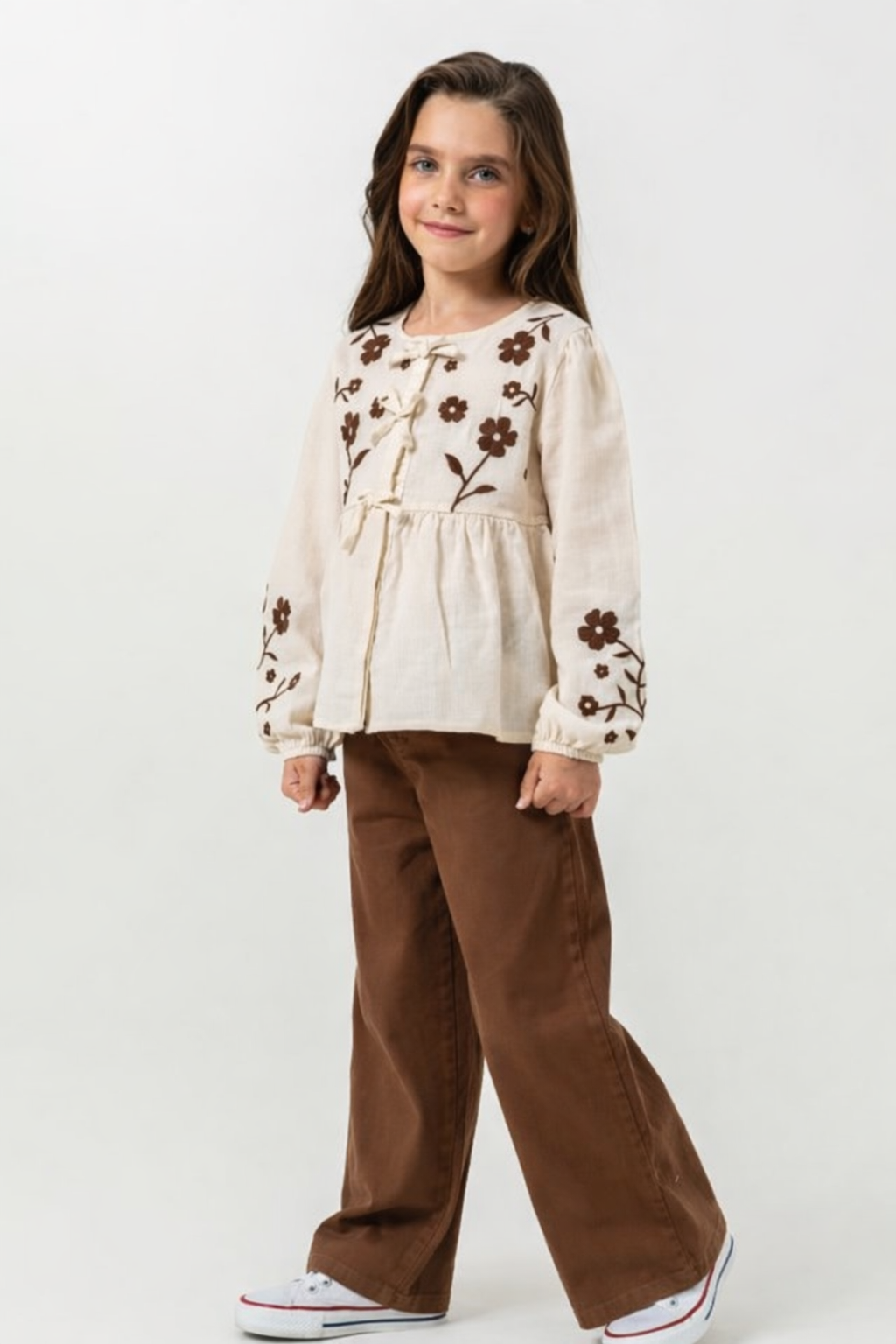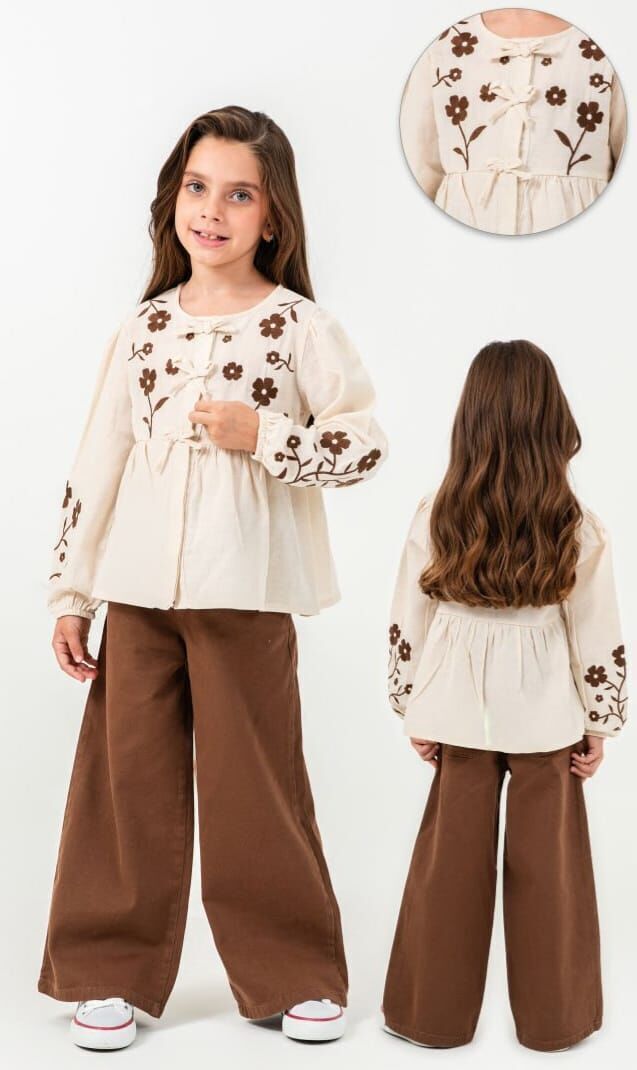 4-8 yaş kız çocukları için tasarlanan çiçek nakışlı bluz ve pantolon takımı, doğal tonları ve zarif detaylarıyla öne çıkar. Uzun kollu bluz ve bol paça pantolondan oluşan bu takım, rahat kesimiyle gün boyu konfor sağlar. Günlük kullanımın yanı sıra şık kombinler için de ideal, modern ve kullanışlı bir seçenektir.