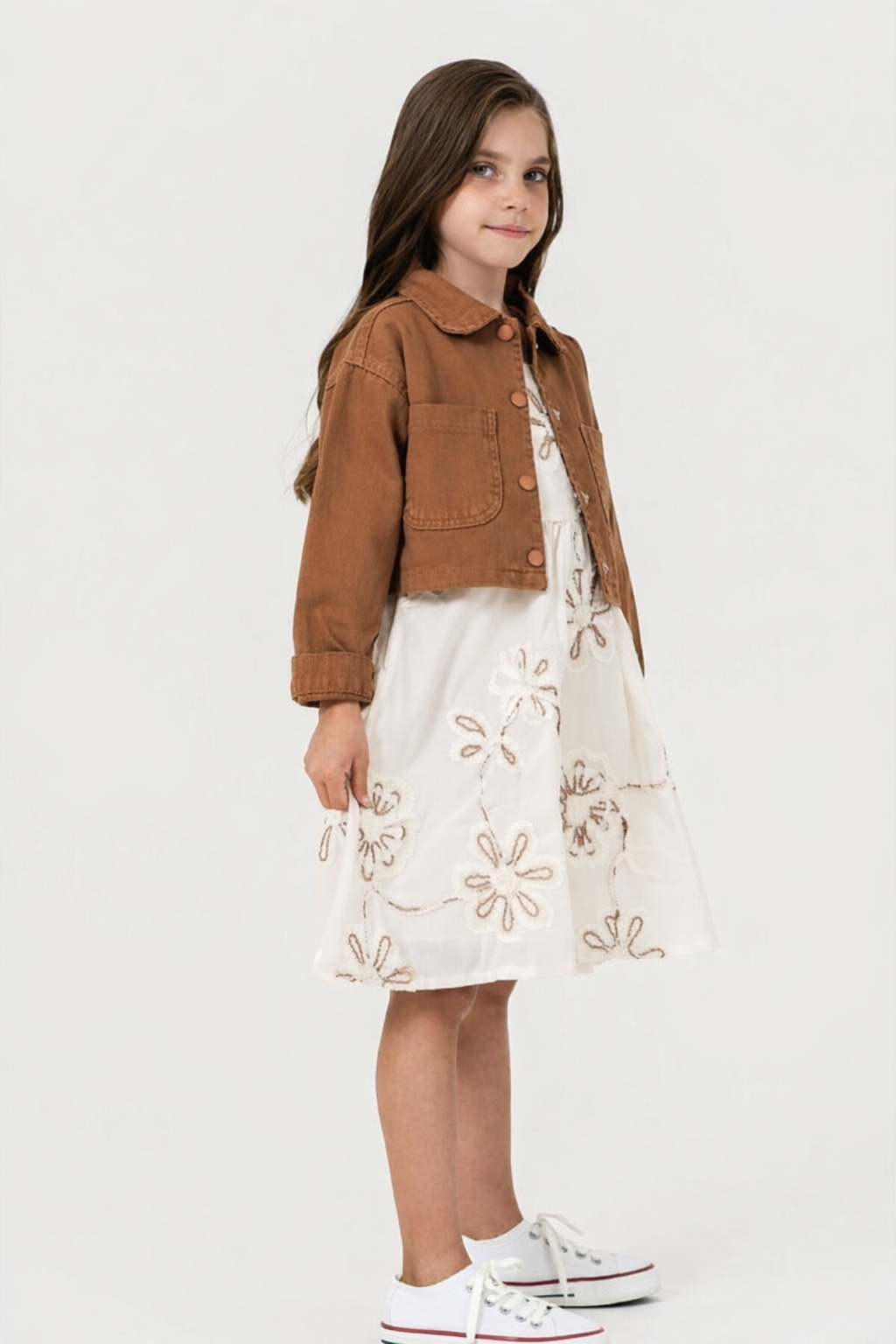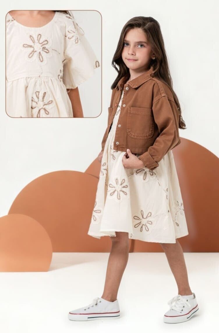 4-8 yaş kız çocukları için tasarlanan ceketli elbise kombini, zarif ve modern görünümüyle öne çıkar. Nakış detaylı elbise ve kısa kahverengi ceket şık bir uyum sunar. Rahat yapısıyla gün boyu konfor sağlar. Doğum günü, bayram ve özel davetlerde tercih edilebilecek şık ve kullanışlı bir kombin seçeneğidir.
