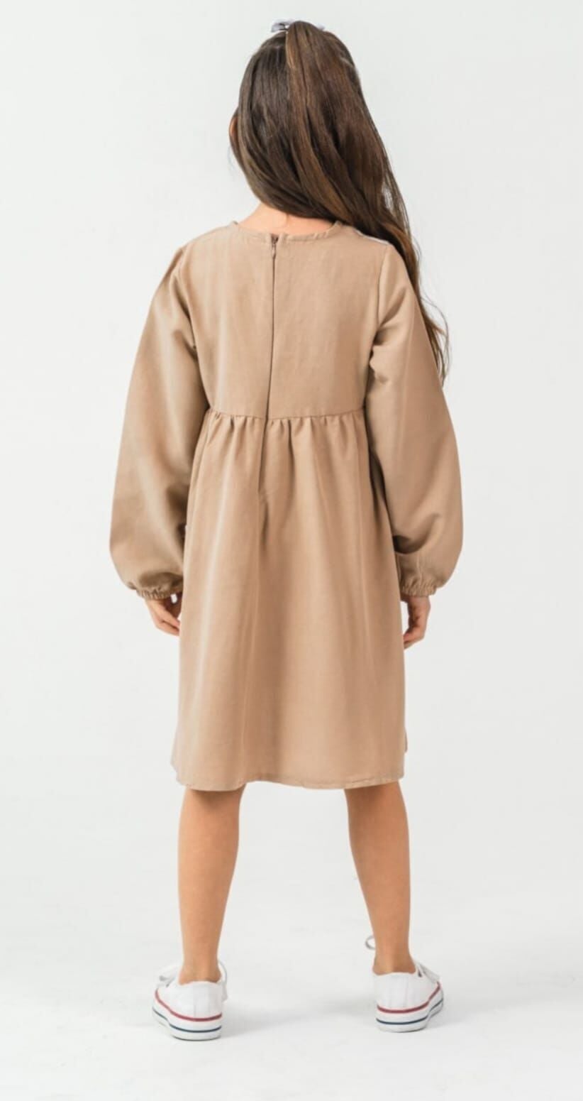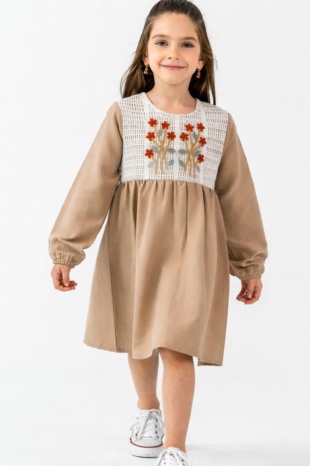 4-8 Yaş Kız Çocuk Nakışlı Uzun Kollu Sütlü Kahve Elbise