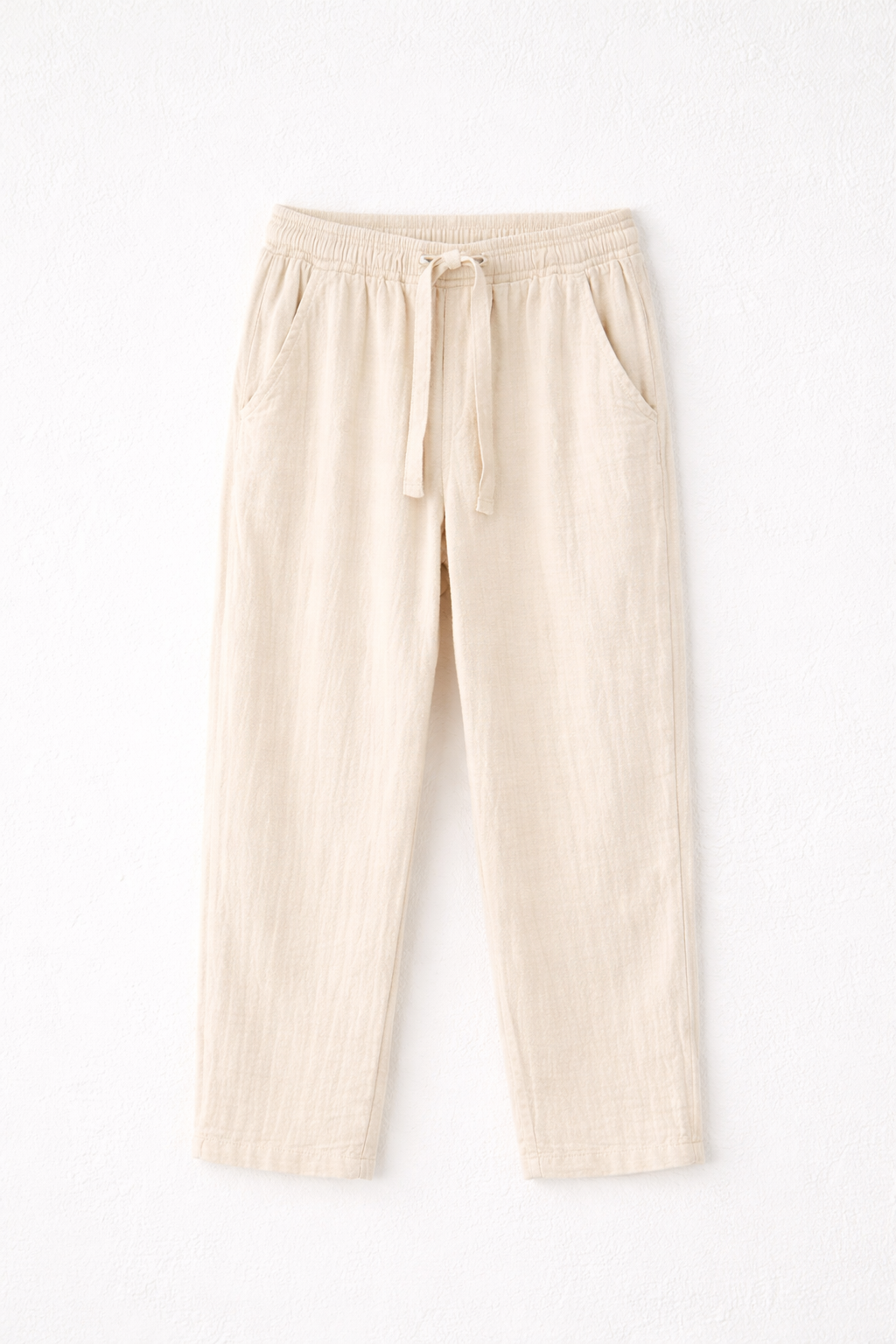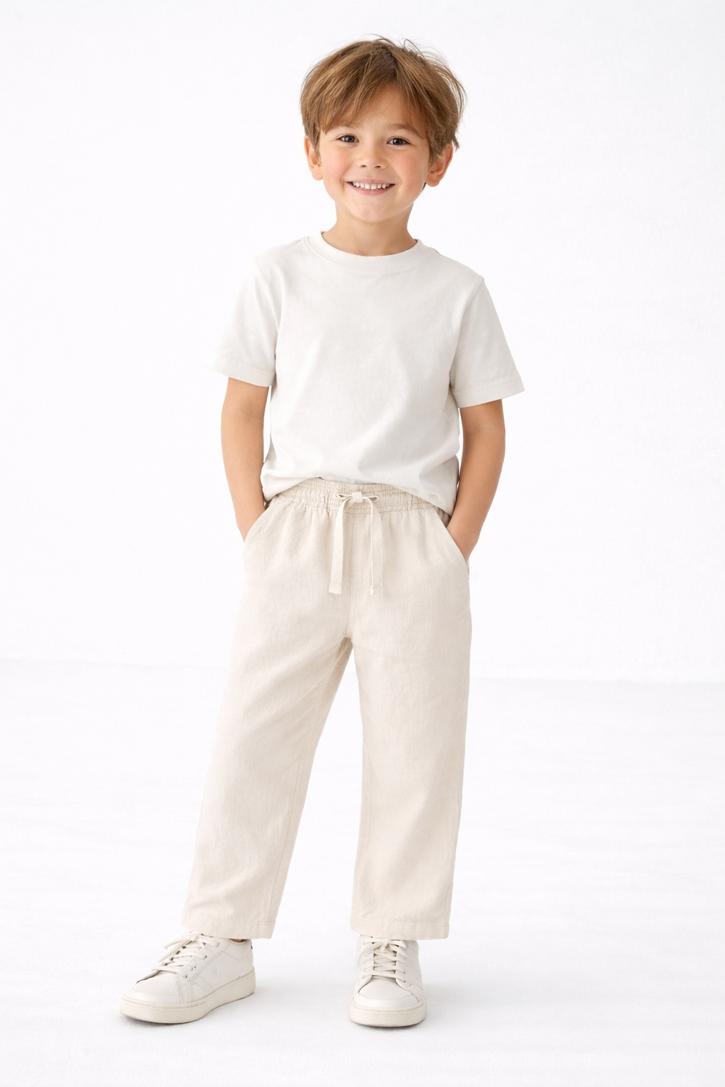 5-16 yaş erkek çocuklar için tasarlanan beyaz müslin çocuk pantolonu, doğal pamuk dokusu ve nefes alabilen yapısıyla gün boyu konfor sağlar. Hafif ve yumuşak müslin kumaşı sayesinde yaz ve bahar aylarında serin bir kullanım sunar. Günlük kullanım, park aktiviteleri ve tatiller için ideal olan bu model, rahat kesimiyle çocukların özgürce hareket etmesine yardımcı olur.