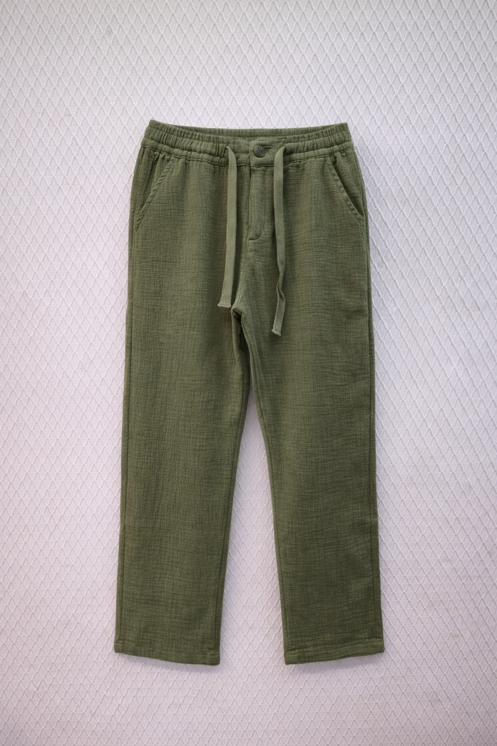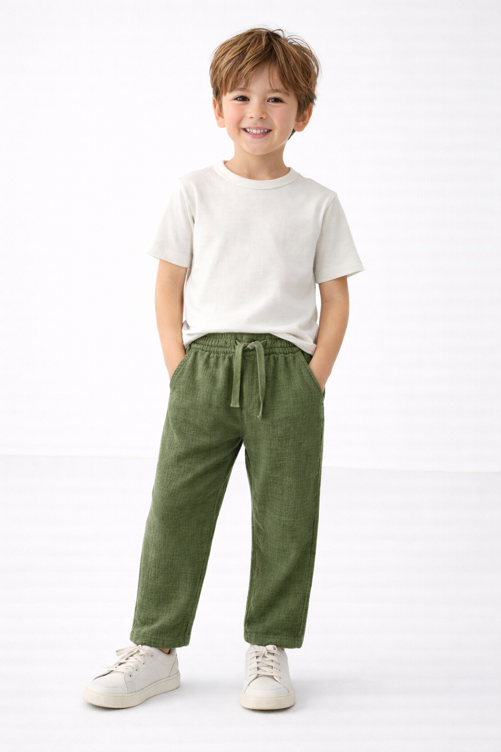 5-16 yaş erkek çocuklar için tasarlanan haki müslin çocuk pantolonu, doğal pamuk dokusu ve nefes alabilen yapısıyla gün boyu rahatlık sağlar. Hafif ve yumuşak müslin kumaşı sayesinde özellikle yaz ve bahar aylarında serin kullanım sunar. Günlük kullanım, park ve tatil için uygun olan bu rahat kesim pantolon, çocukların özgürce hareket etmesine yardımcı olur.