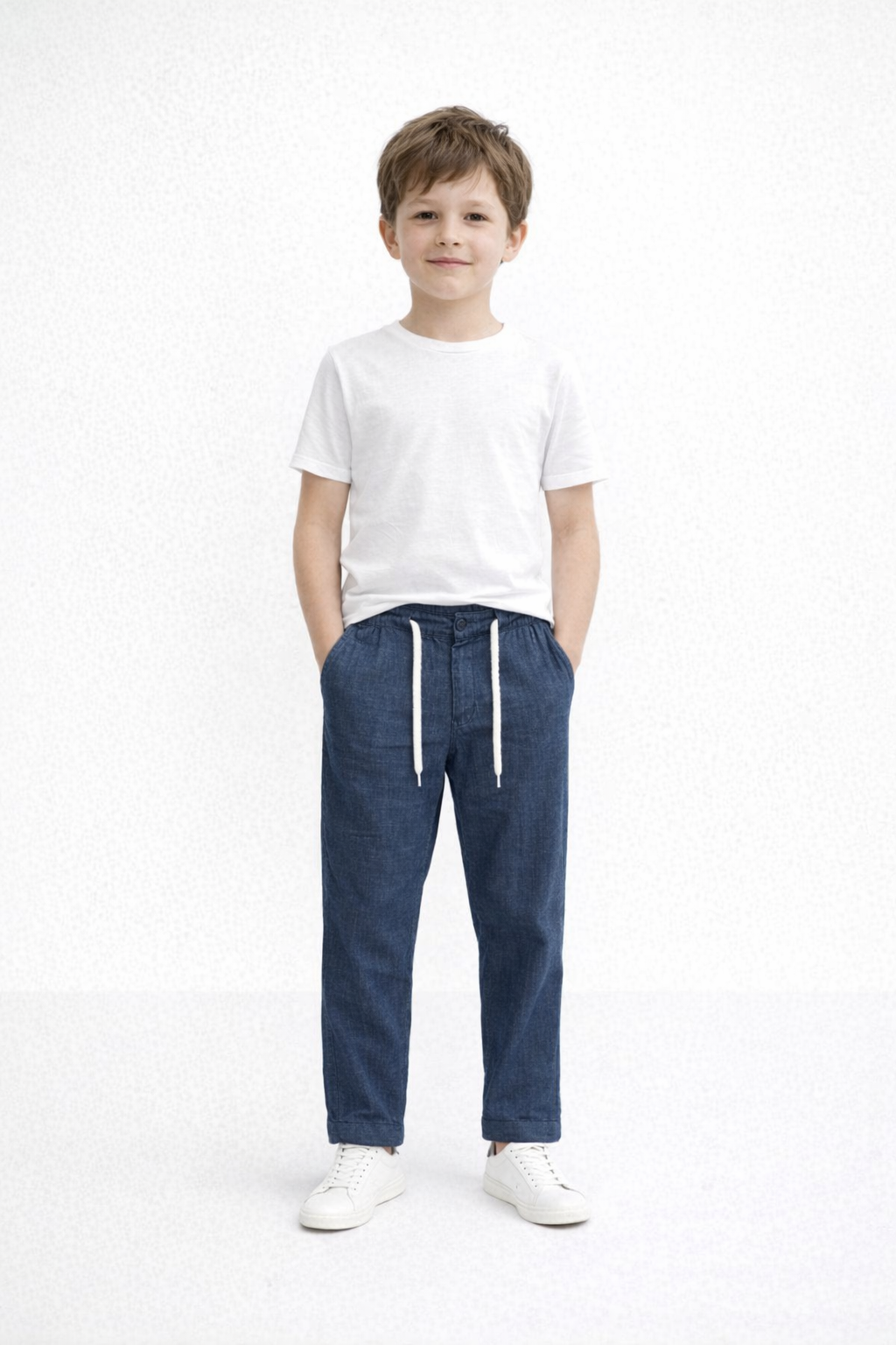 5-16 yaş erkek çocuk lacivert bağcıklı keten pantolon, rahat ve şık bir kullanım sunar. Yumuşak dokulu kumaşı gün boyu konfor sağlar. Ayarlanabilir bağcıklı beli ve modern kesimi ile hareket özgürlüğünü destekler.