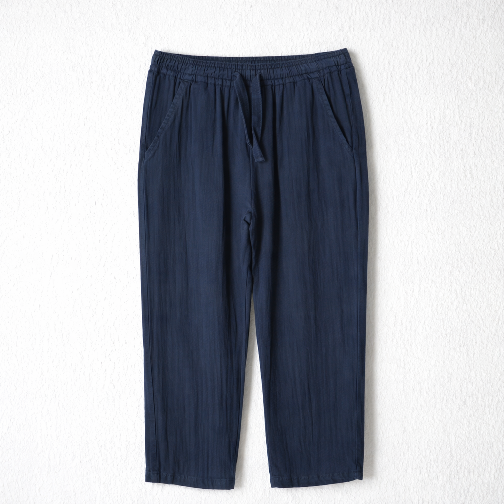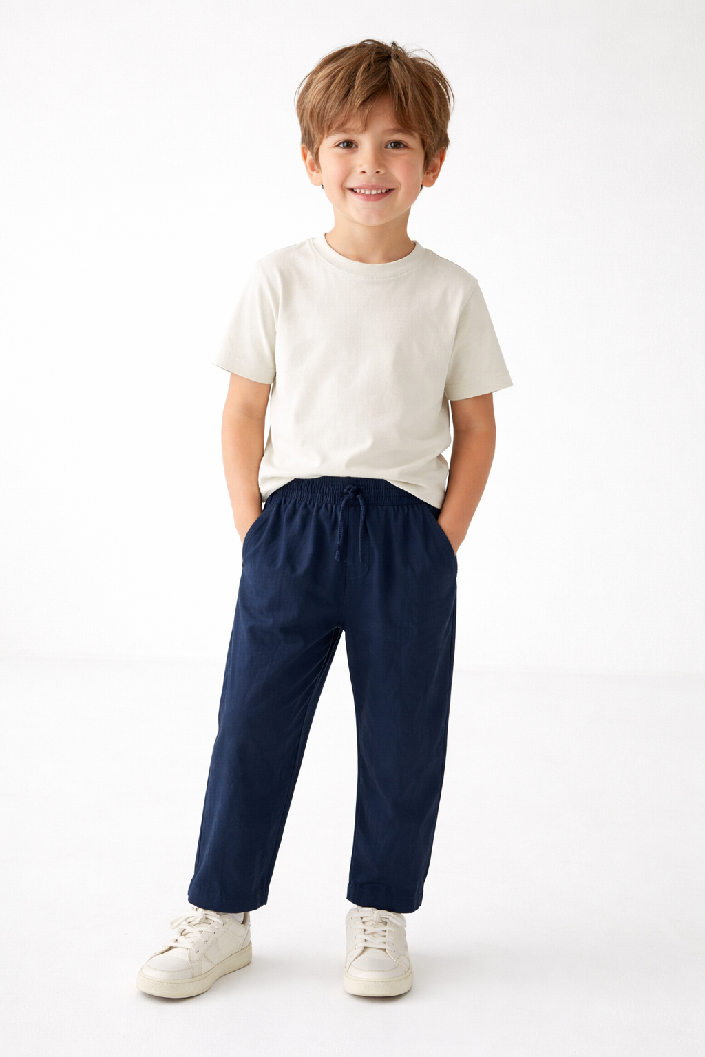 5-16 yaş erkek çocuk lacivert müslin pantolon, doğal pamuk dokusu ve nefes alabilen yapısıyla gün boyu konfor sunar.