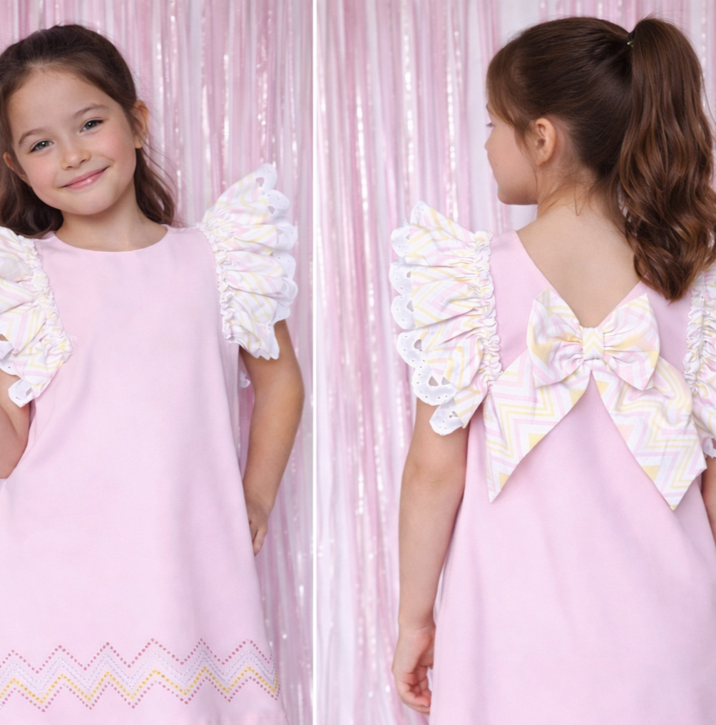 6-12 yaş zarif tasarımıyla öne çıkan pembe kız çocuk elbisesi, fırfırlı kol detayları ve arka kısmındaki büyük fiyonk tasarımı ile şık bir görünüm sunar.