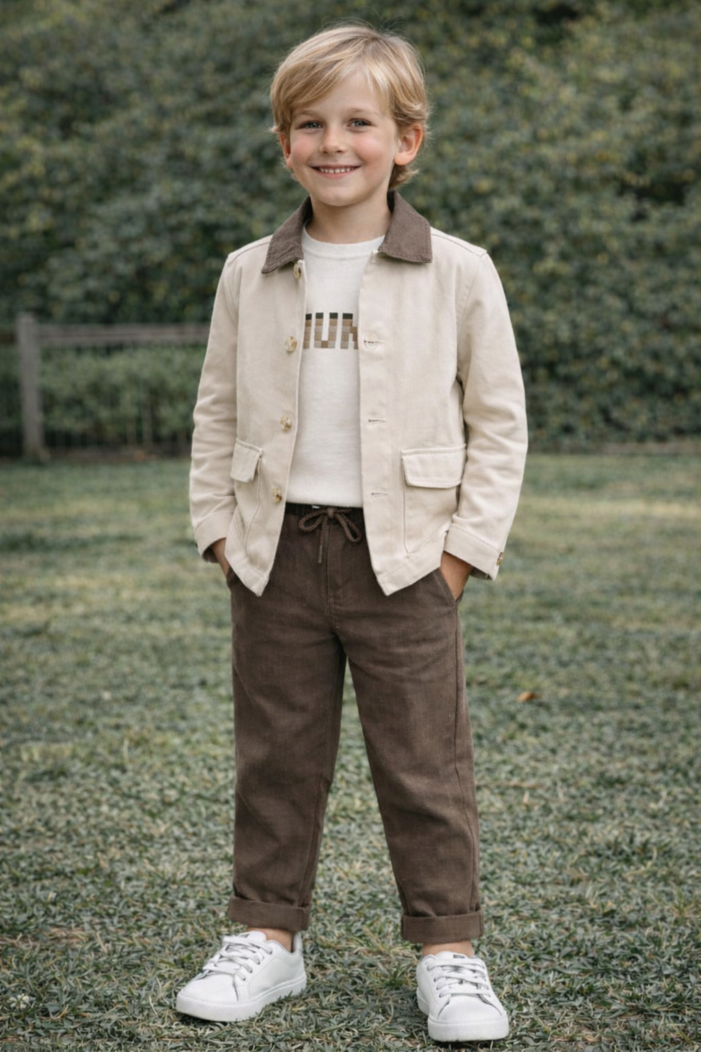 8-14 yaş erkek çocukları için tasarlanan bej ceket, kahverengi pantolon ve tişört takımı, modern ve sade görünümüyle öne çıkar. Rahat kesimi sayesinde gün boyu konfor sağlar. Zamansız renk uyumuyla dikkat çeken bu kombin, günlük kullanımın yanı sıra doğum günü, bayram ve davetlerde tercih edilebilecek şık bir seçenektir.