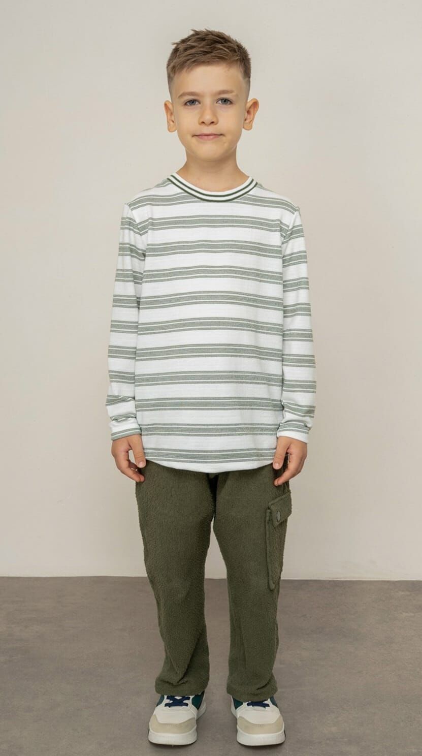 8-14 yaş erkek çocuk zeytin yeşili çizgili ince triko, şık ve rahat tasarımıyla günlük kullanım için ideal bir parçadır. Hafif ve nefes alabilen kumaşı sayesinde özellikle ilkbahar ve sonbahar aylarında konfor sağlar. Yumuşak dokusu gün boyu rahatlık sunar. Jean, pantolon veya eşofman altı ile kolayca kombinlenerek hem spor hem de şık kombinler oluşturulabilir.