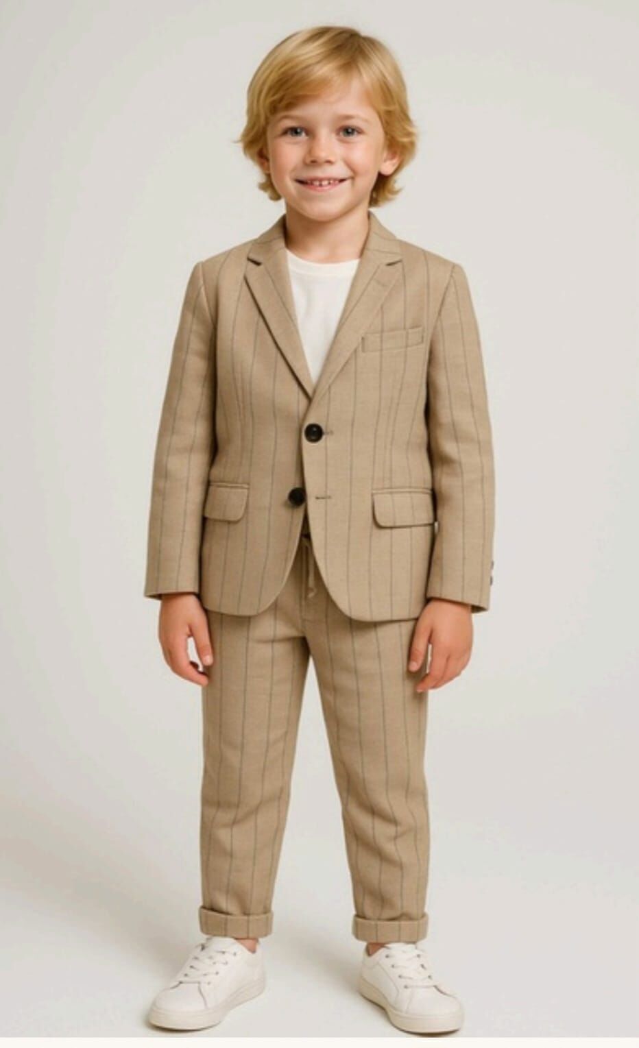 9-14 yaş erkek çocukları için tasarlanan bej çizgili blazer ceket takım, modern ve şık görünümüyle öne çıkar. Ceket, pantolon ve tişörtten oluşan bu kombin, rahat ve stil sahibi bir kullanım sunar. Düğün, doğum günü, bayram ve davetlerde tercih edilebilecek bu model, farklı ayakkabılarla kolayca kombinlenebilir.