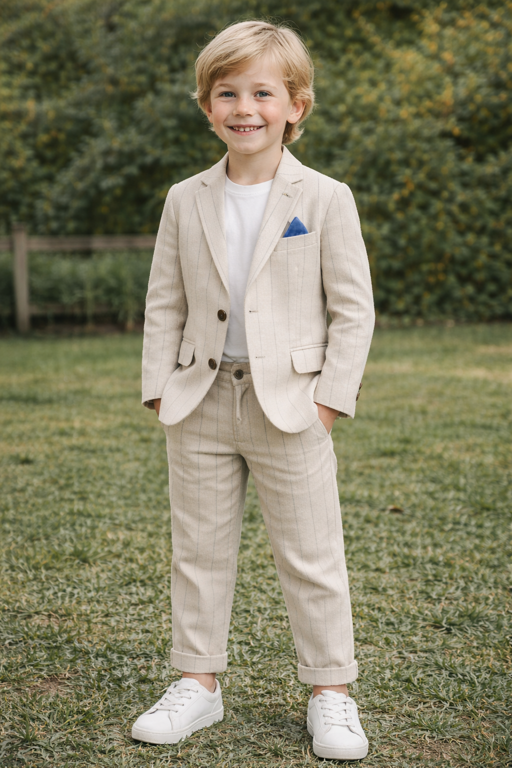 9-14 Yaş Erkek Çocuk Ekru Çizgili Blazer Ceket Takım