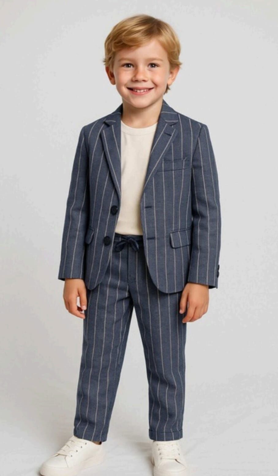 9-14 yaş erkek çocukları için tasarlanan lacivert çizgili blazer ceket takım, modern ve şık görünümüyle öne çıkar. Ceket, pantolon ve tişörtten oluşan bu kombin, rahat ve stil sahibi bir kullanım sunar. Düğün, doğum günü, bayram ve davetlerde tercih edilebilecek bu model, farklı ayakkabılarla kolayca kombinlenebilir.