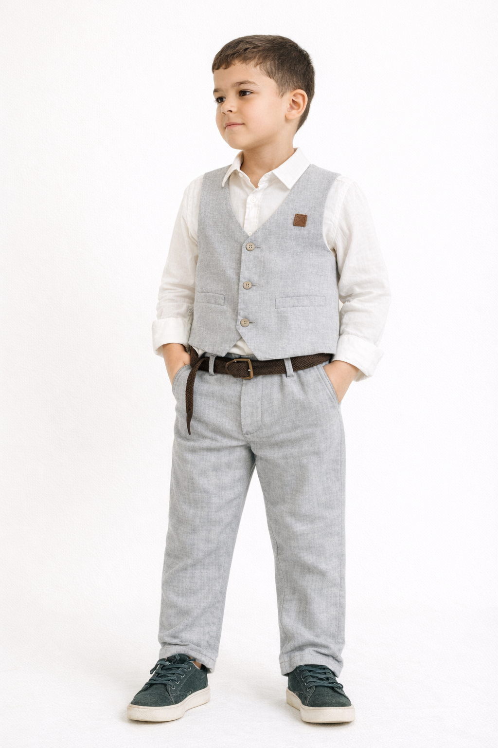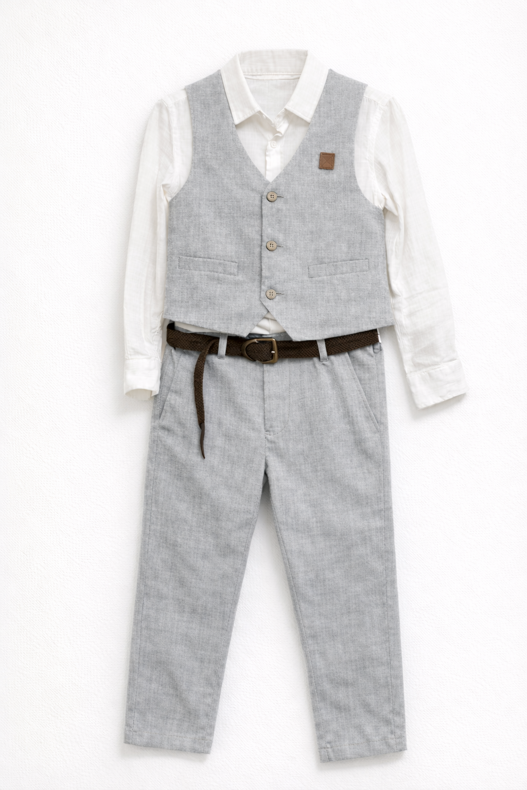 Pantolon, yelek ve beyaz gömlek ile kombinlenerek zarif bir stil oluşturur. Minimal ve modern tasarımı sayesinde düğün, bayram, doğum günü ve özel etkinliklerde tercih edilebilecek ideal bir erkek çocuk takım elbise modelidir.