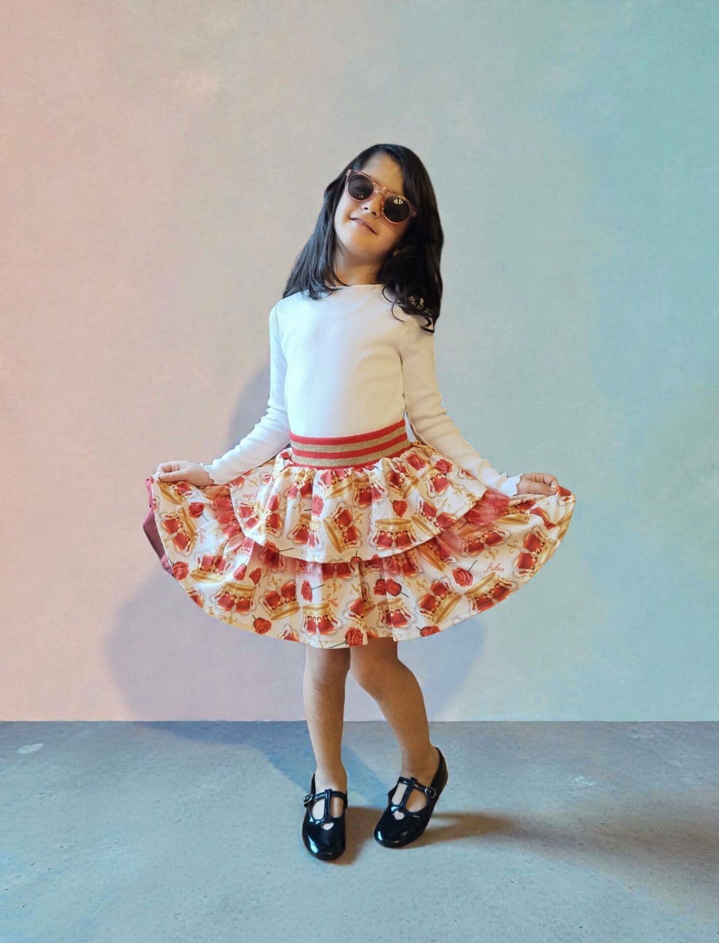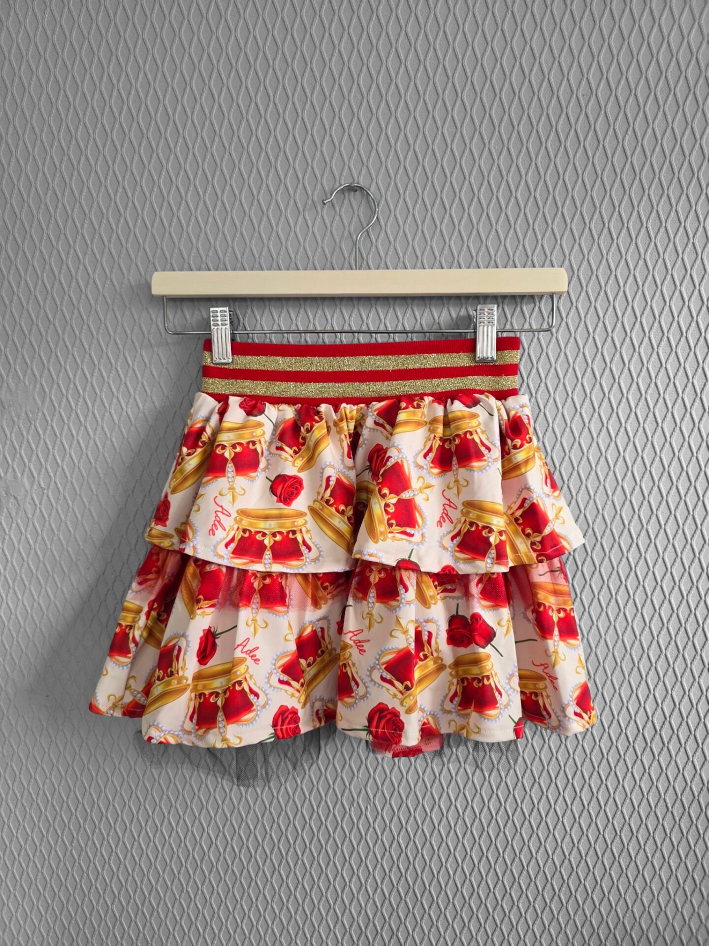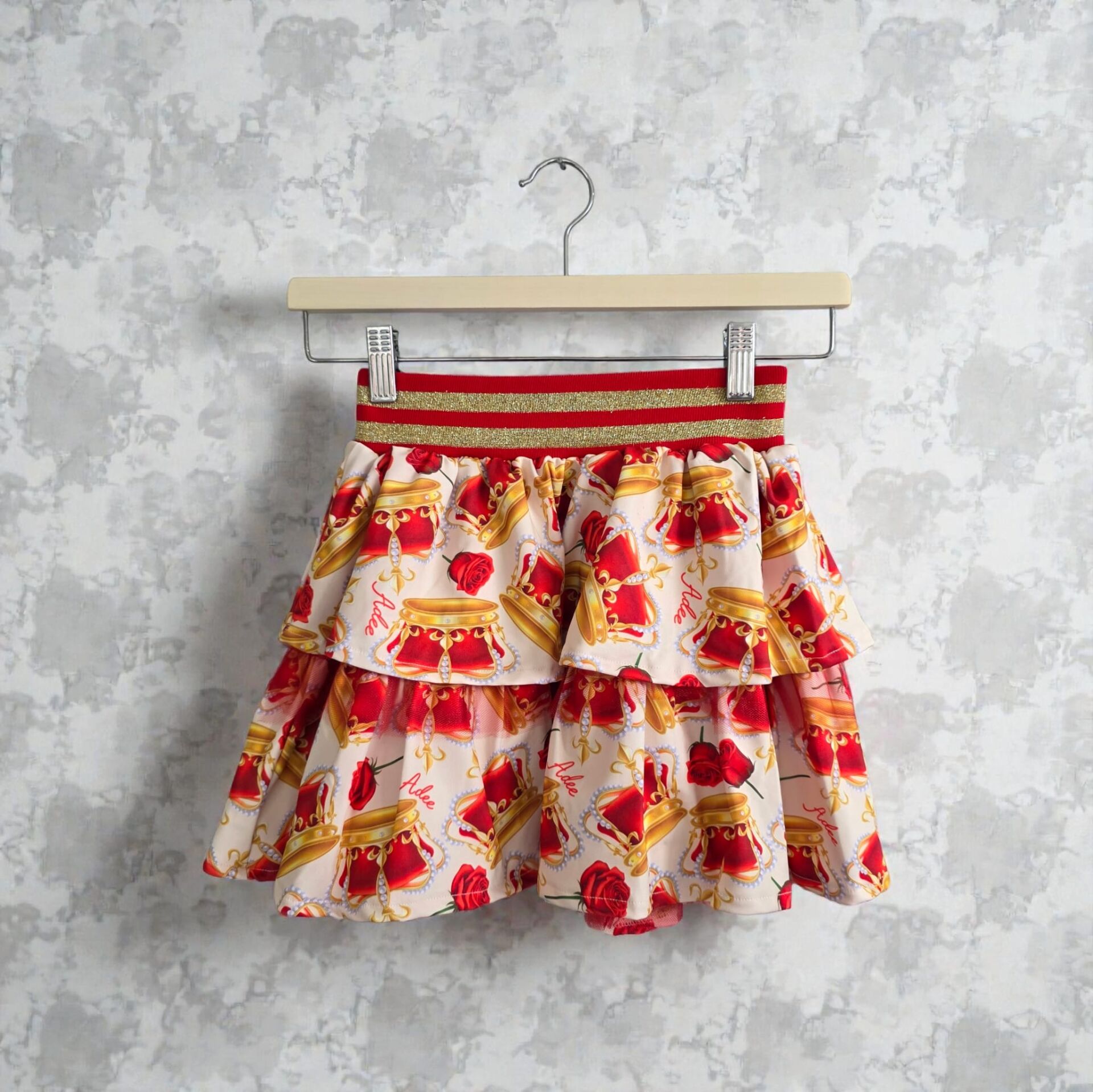 Bej Üzerine Kırmızı Gül ve Taç Desenli Katlı Kız Çocuk Eteği – Zarif ve Masalsı Tasarım