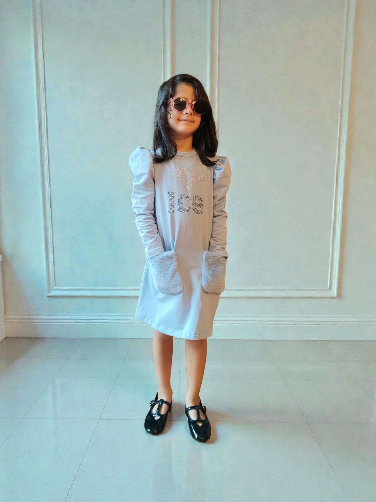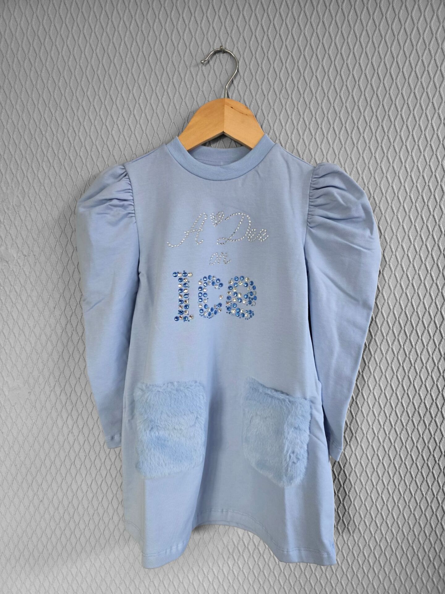 Mavi, Cepleri Kürklü, Şık Tasarım Kız Çocuk Elbisesi